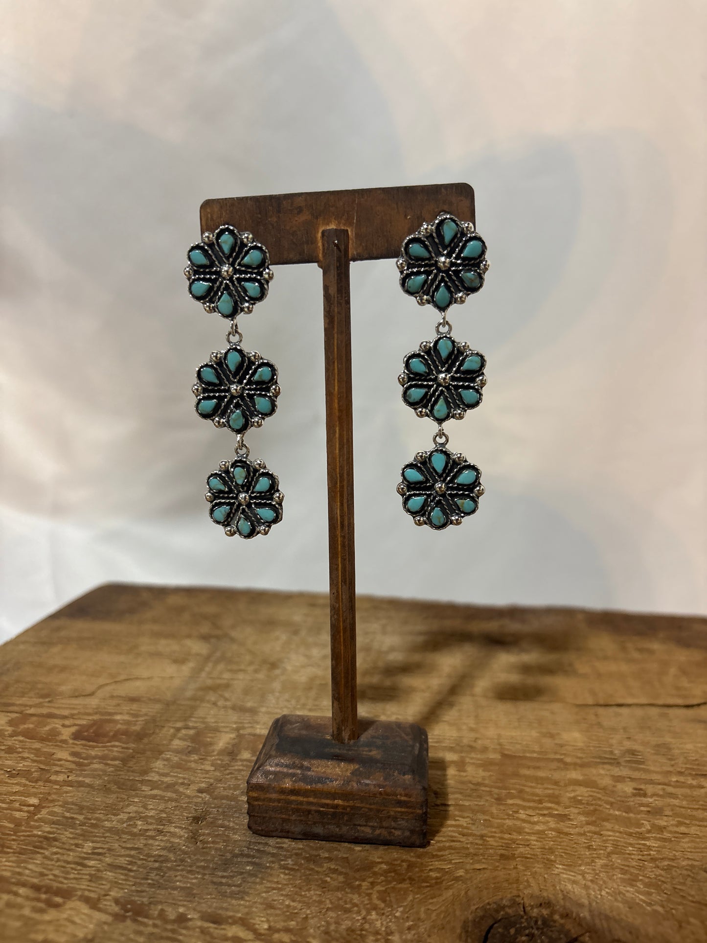 P Diamond Triple flower drop earring , sterling sliver and turquiose