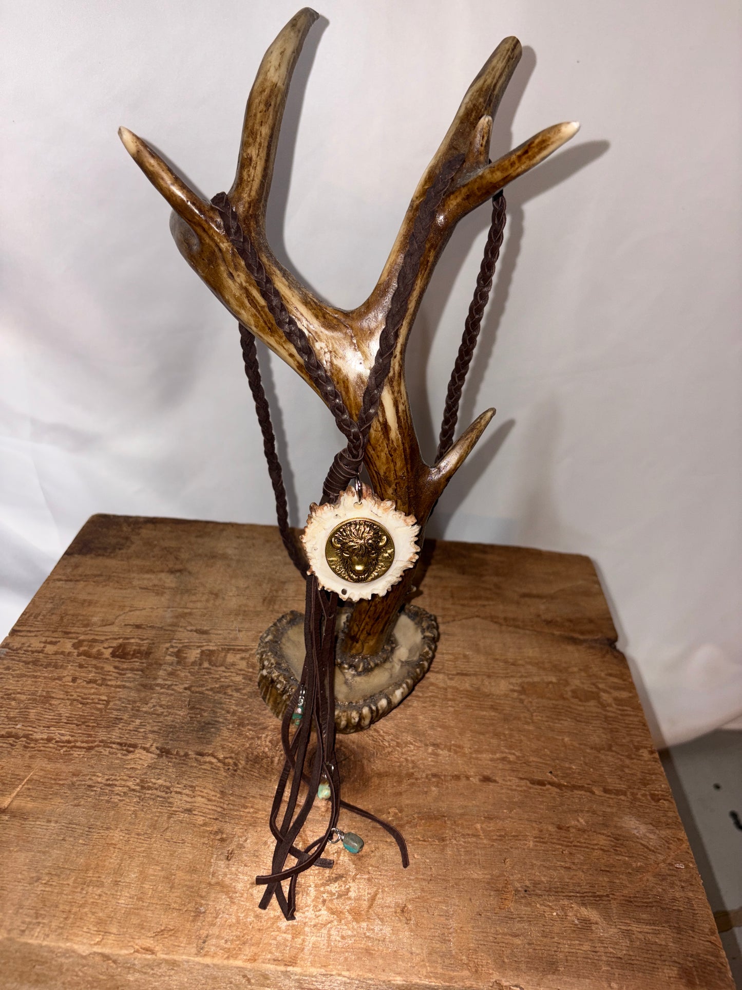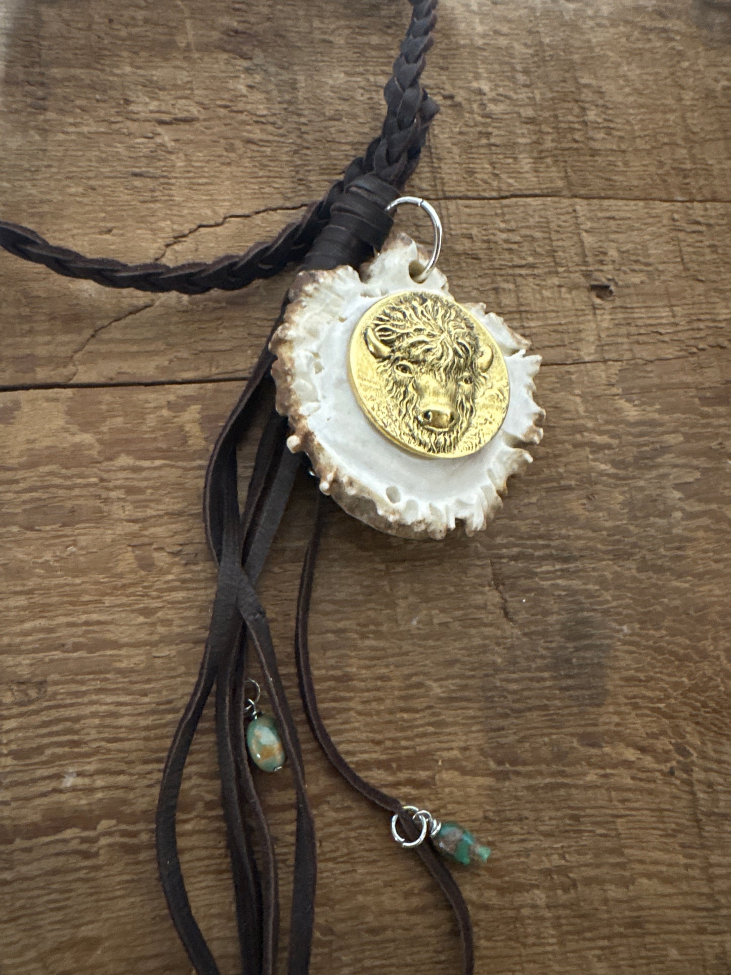 P Diamond Bison antler Burr on chocolate deerskin necklace