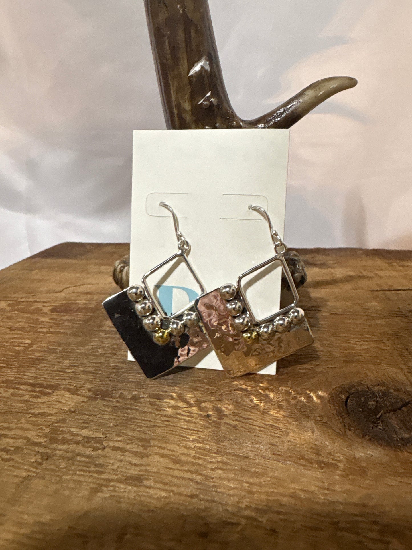 P Diamond Open hammered triangle with gold and silver balls earrings